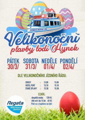 Poprvé v letošním roce rozčeří hladinu Máchova jezera výletní loď. O nadcházejícím prodlouženém velikonočním víkendu vypluje loď Hynek na vyhlídkové plavby. Z přístaviště v Doksech budeme vyplouvat ve 13:00 a v 15:00 hod., z přístaviště Hotel Port ve 13:10 a v 15:10 a z přístaviště ve Starých Splavech ve 13:30 a v 15:30. Lístky se kupují u kapitána při nástupu na loď. Cena je 120 Kč/dospělá osoba a 65 Kč/dítě od 4 do 15 let. Těšíme se na palubě. Pro další informace volejte tel.: 773 915 906.