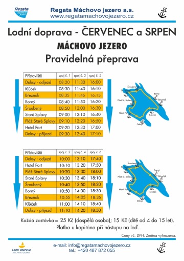 Jsou denně v časech 11:00, 13:00, 14:30 a 16:30 hodin z přístaviště v Doksech. Z přístaviště Staré Splavy v 15:00 hodin.